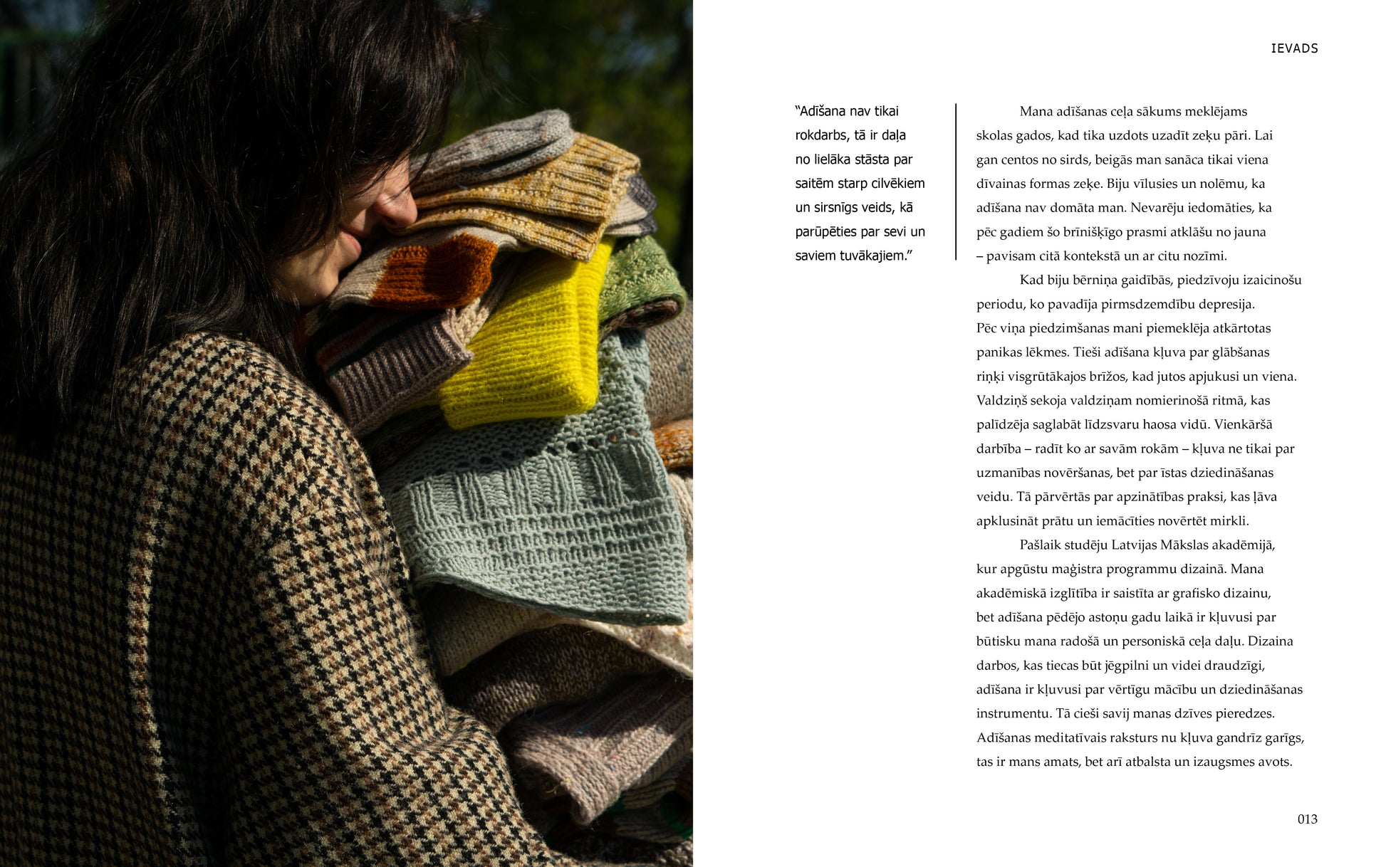 - Grāmata "Adi un Lolo" (352 lappuses) — 22 adīšanas apraksti, personīgi stāsti, intervijas un refleksijas par radošumu, emocionālo veselību un kopienas nozīmi.